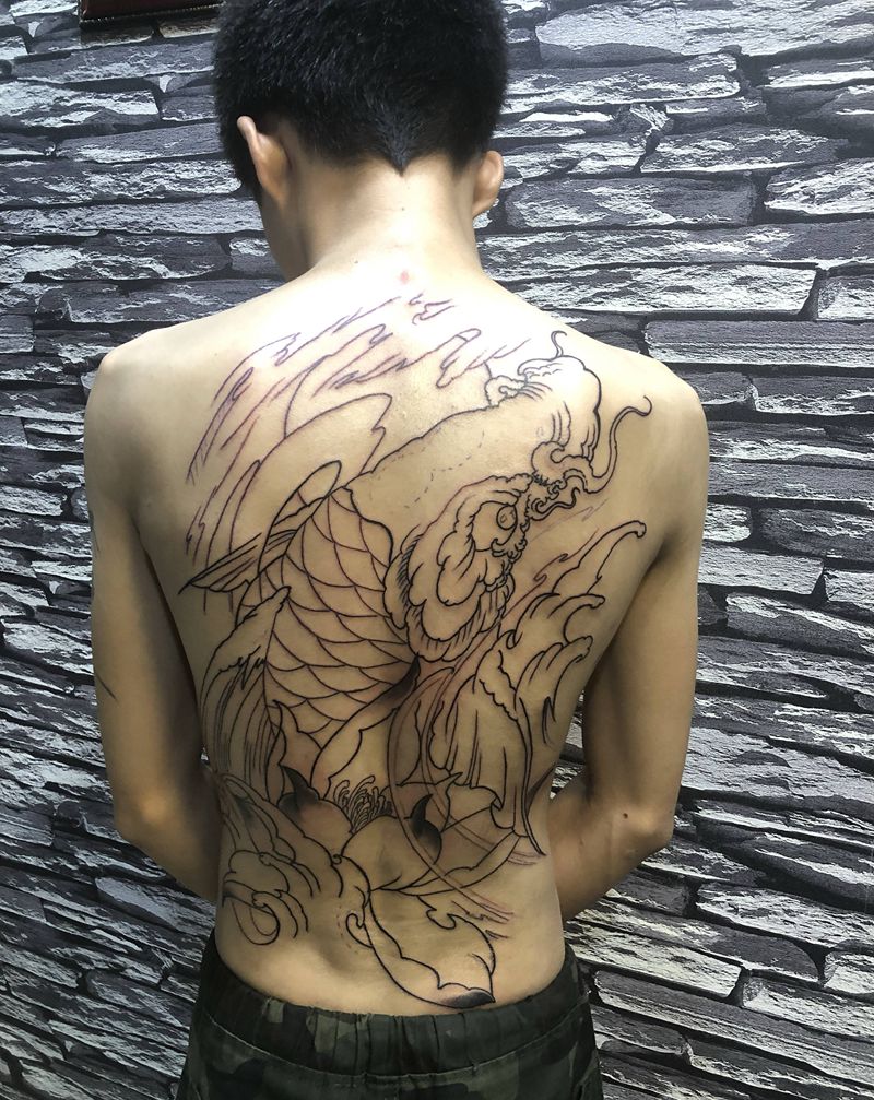 鲤鱼满背线条纹身图片_背部新传统纹身图案