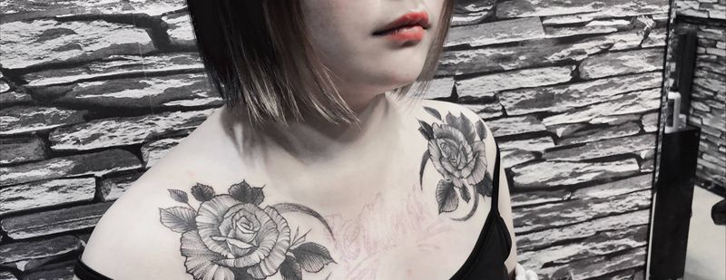 双肩素花纹身图片_胸部肩部点刺纹身图案