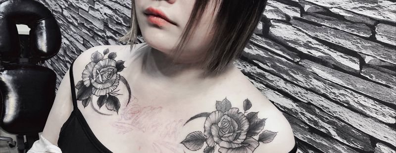 双肩素花纹身图片_胸部肩部点刺纹身图案