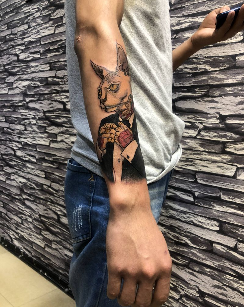 斯芬克斯绅士纹身图片_手臂水彩欧美写实纹身图案