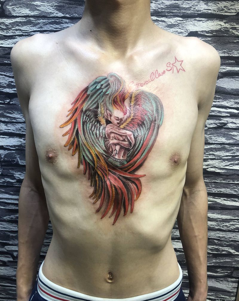 天使之翼纹身图片_胸部水彩纹身图案