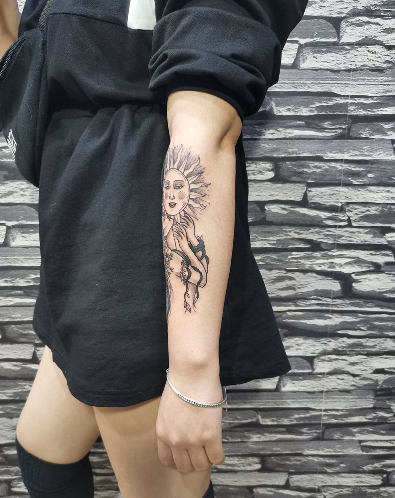 太阳女孩纹身图片_手臂欧美写实纹身图案