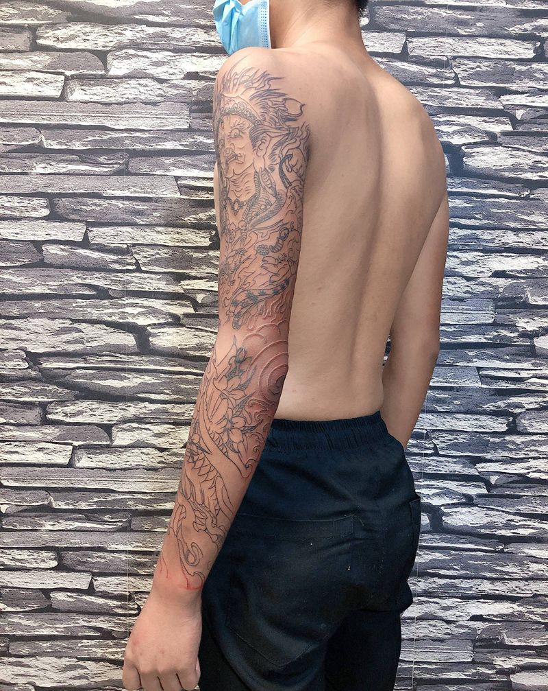 不动明王花臂线条纹身图片_手臂新传统纹身图案