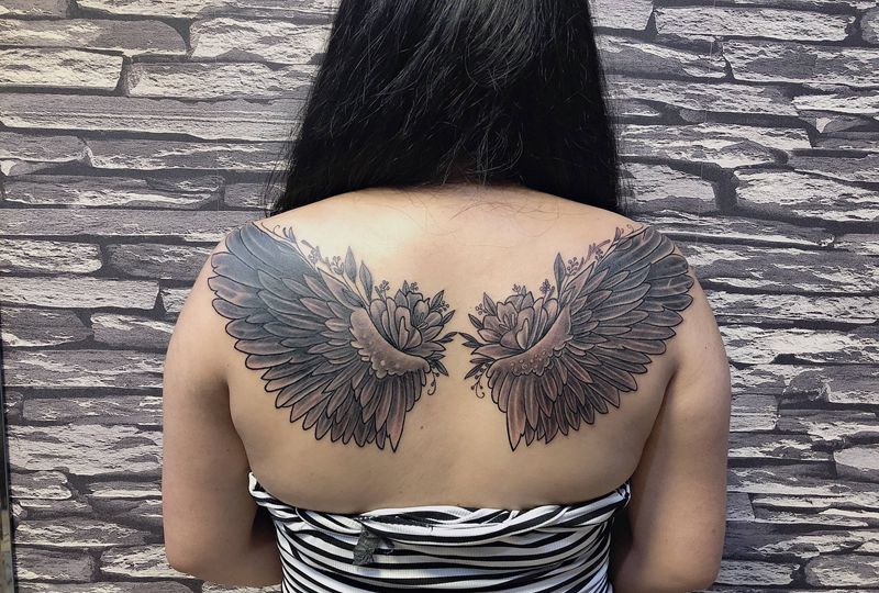 当前位置: 首页 >广东省中山市纹身店-吉刺青纹身图案>翅膀遮盖旧纹身纹身图片_背部肩部欧美写实水墨纹身图案