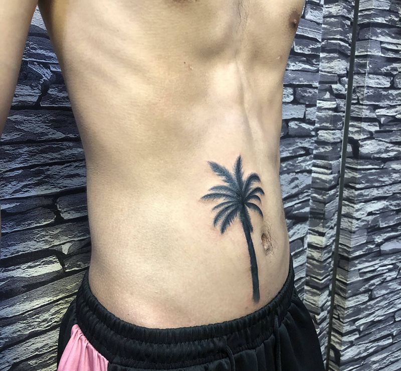 椰树盖疤痕纹身图片_腹部水墨纹身图案
