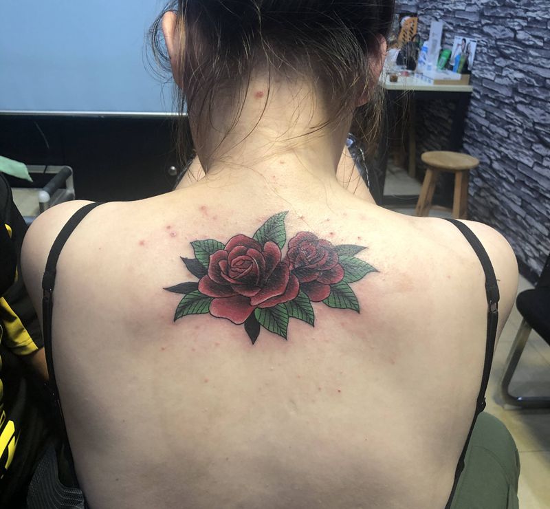 玫瑰遮盖旧图腾纹身图片_背部水彩纹身图案