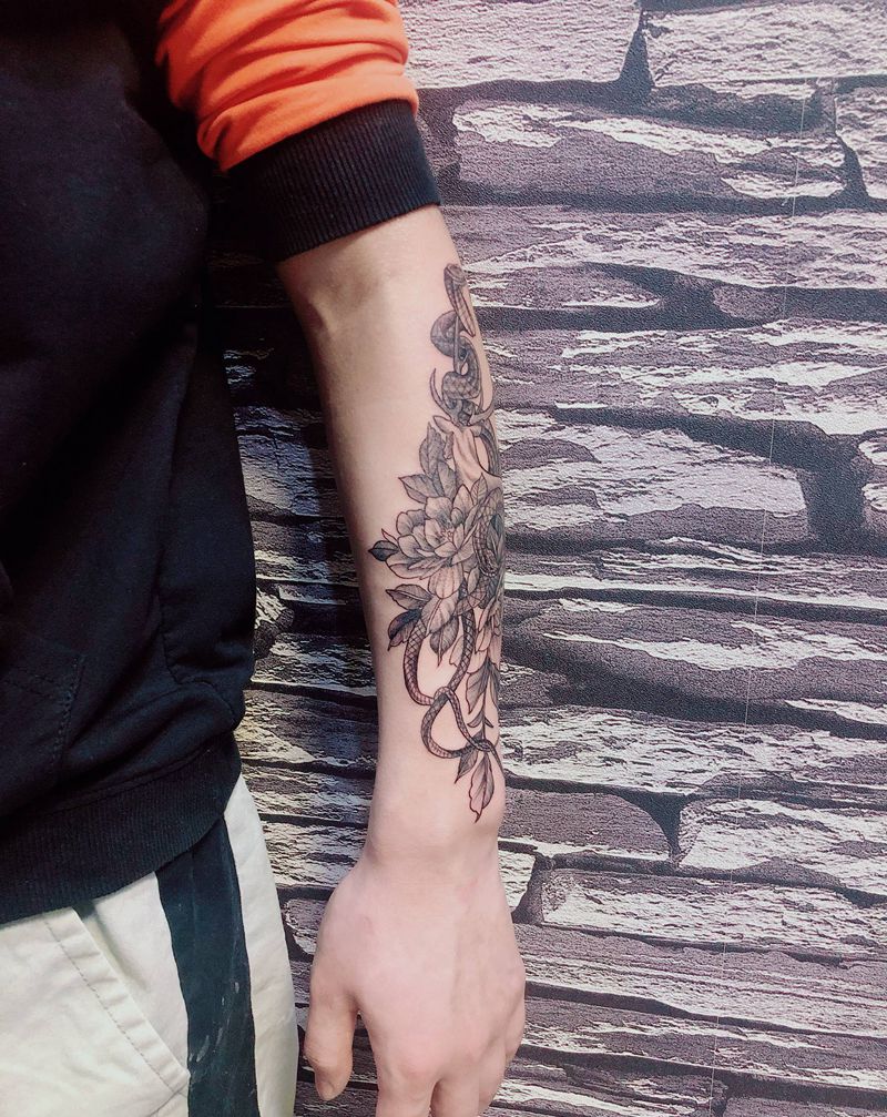 当前位置: 首页 >广东省中山市纹身店-吉刺青纹身图案>麋鹿与蛇与花纹身图片_手臂点刺纹身图案