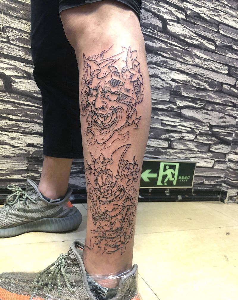 般若鬼武士纹身图片_腿部新传统纹身图案