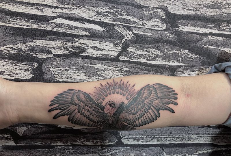 当前位置: 首页 >广东省中山市纹身店-吉刺青纹身图案>雄鹰展翅纹身图片_手臂点刺纹身图案