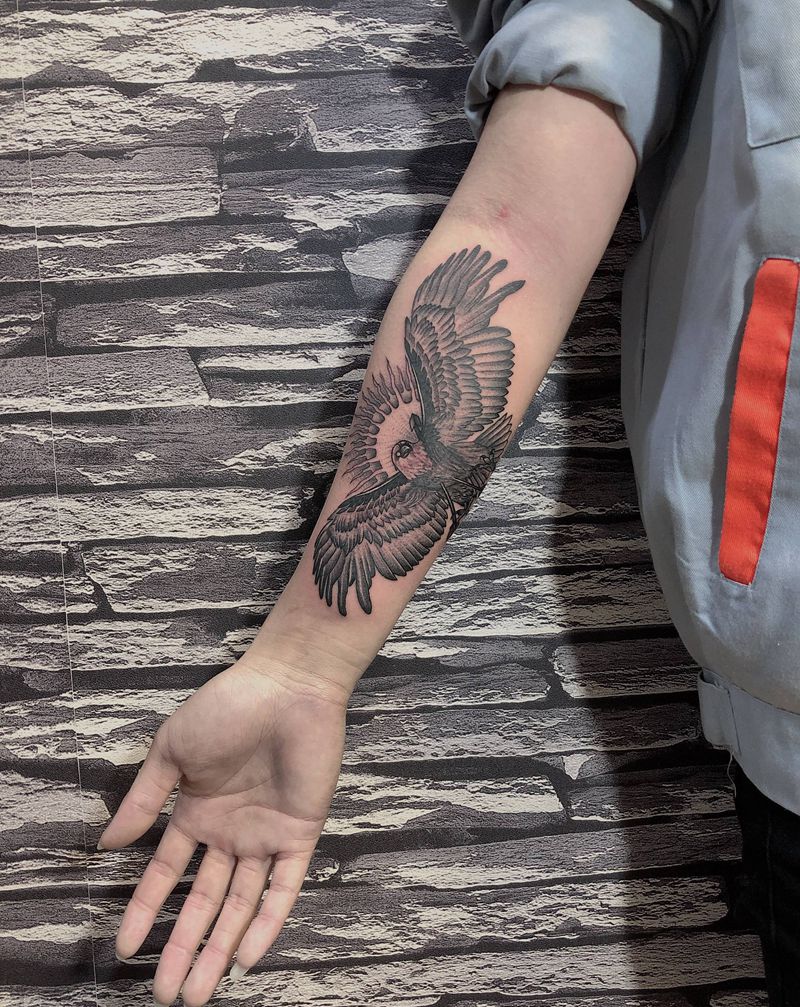 当前位置: 首页 >广东省中山市纹身店-吉刺青纹身图案>雄鹰展翅纹身图片_手臂点刺纹身图案