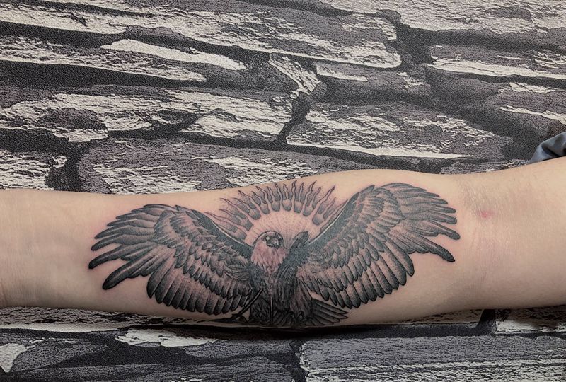 当前位置: 首页 >广东省中山市纹身店-吉刺青纹身图案>雄鹰展翅纹身图片_手臂点刺纹身图案