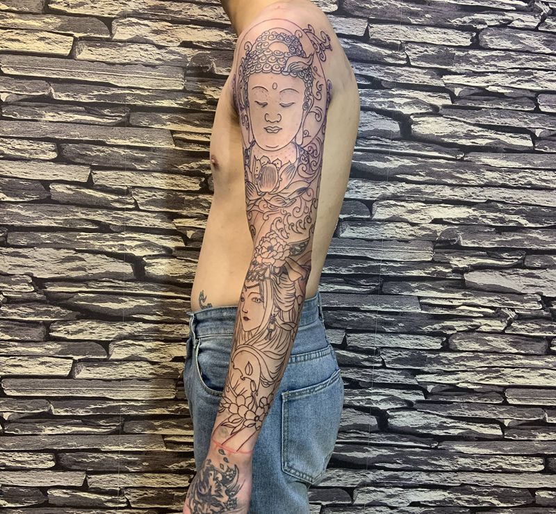 当前位置: 首页 >广东省中山市纹身店-吉刺青纹身图案>佛与妲己纹身图片_手臂新传统纹身图案