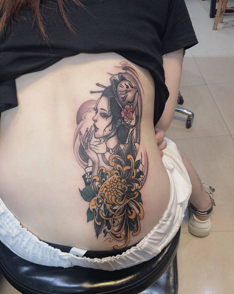 美女遮盖旧文身纹身图片_腰部水彩欧美写实纹身图案