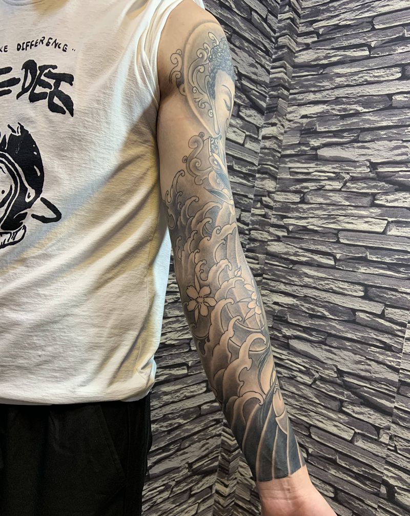 佛与美女组合花臂纹身图片_手臂新传统纹身图案
