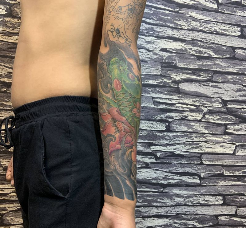 当前位置: 首页 >广东省中山市纹身店-吉刺青纹身图案>鲤鱼纹身图片_手臂新传统纹身图案