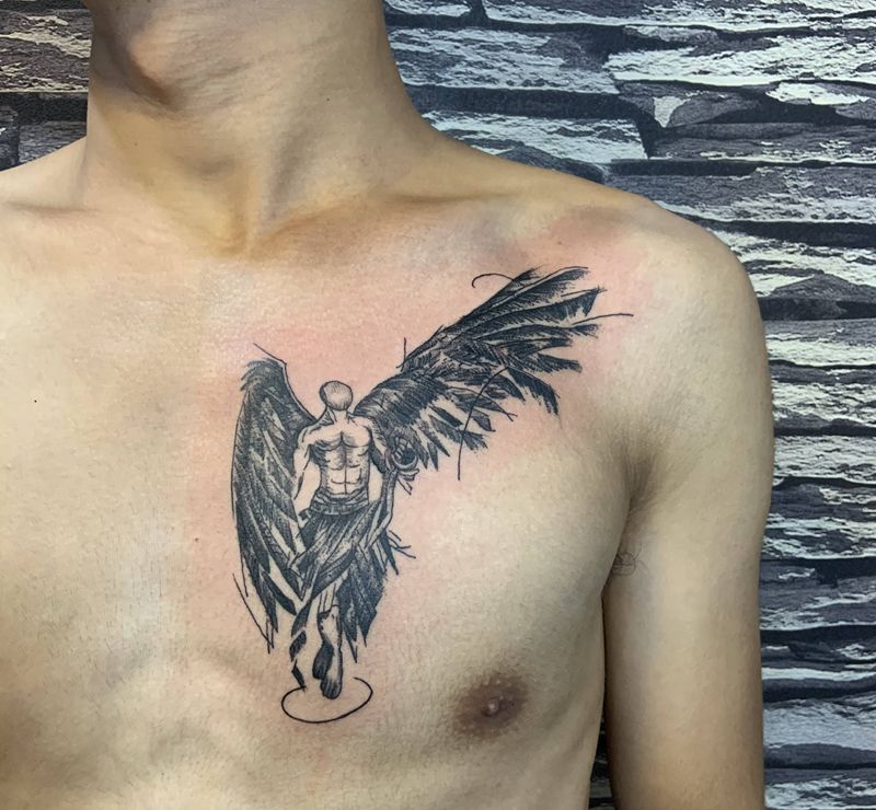 天使之翼纹身图片_胸部欧美写实纹身图案