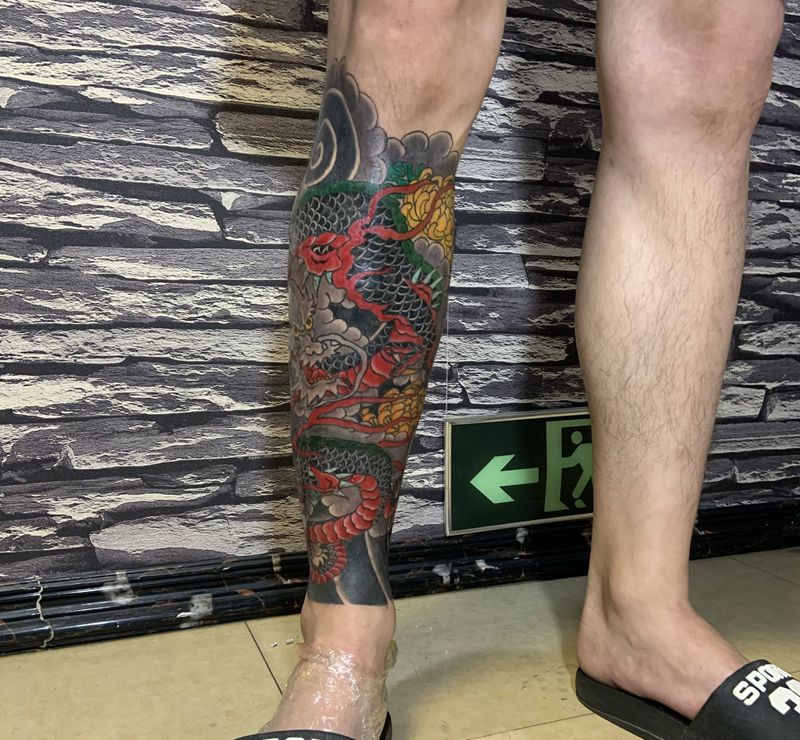 • T网红王老大花腿龙纹身图片_腿部新传统纹身图案