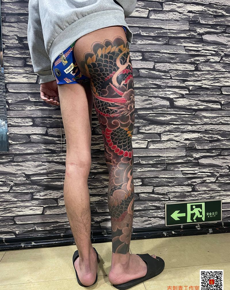 • T网红王老大花腿龙纹身图片_腿部新传统纹身图案