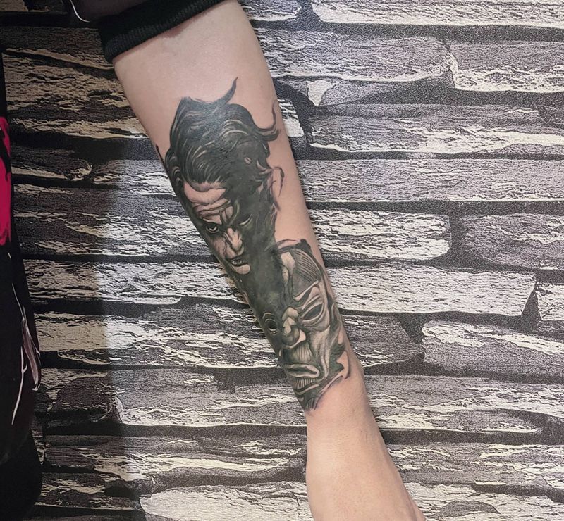 当前位置: 首页 >广东省中山市纹身店-吉刺青纹身图案>小丑遮盖匕首纹身图片_手部手臂欧美写实纹身图案
