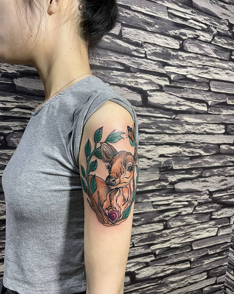 当前位置: 首页 >广东省中山市纹身店-吉刺青纹身图案>小鹿纹身图片_手臂New School水彩纹身图案