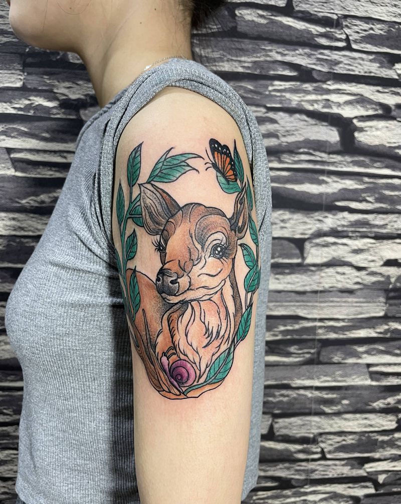 当前位置: 首页 >广东省中山市纹身店-吉刺青纹身图案>小鹿纹身图片_手臂New School水彩纹身图案