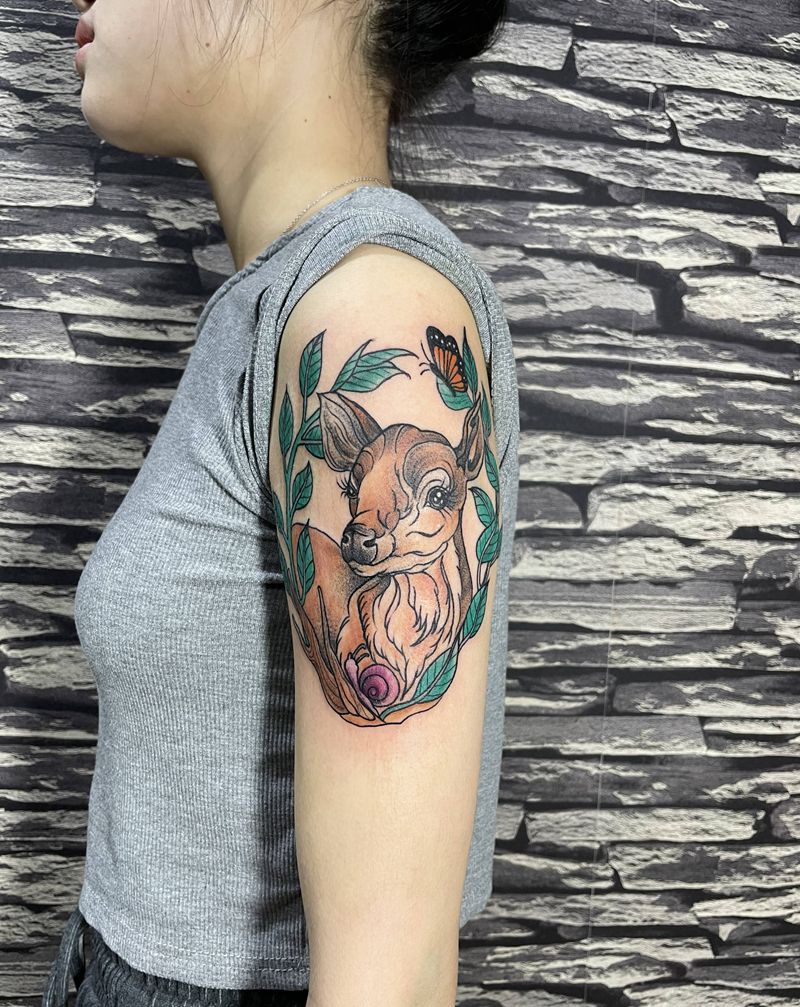 当前位置: 首页 >广东省中山市纹身店-吉刺青纹身图案>小鹿纹身图片_手臂New School水彩纹身图案