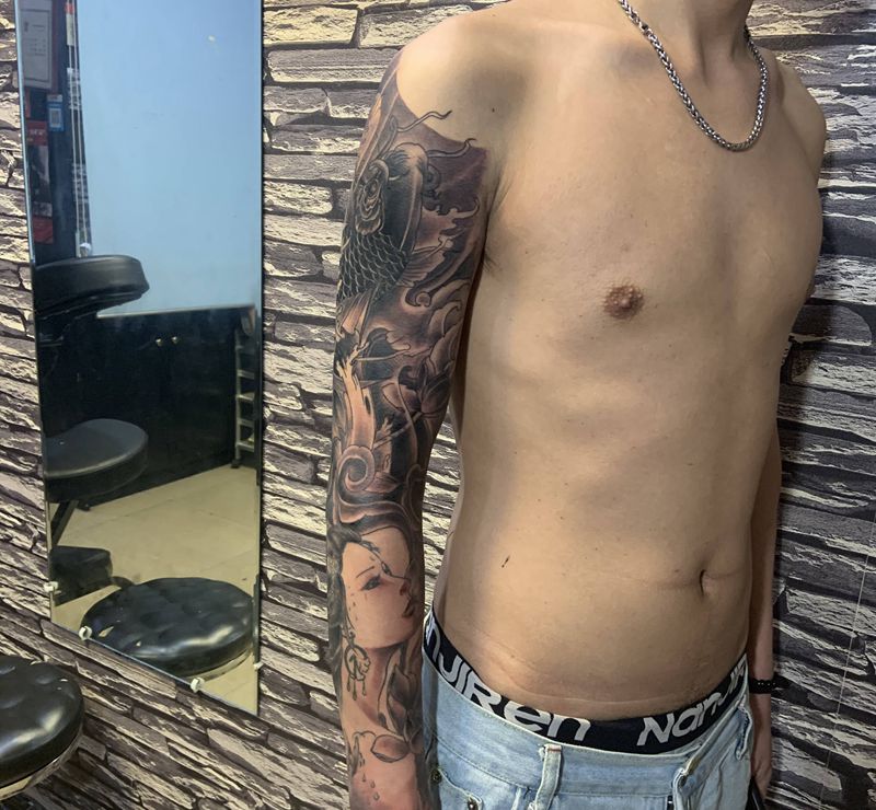 当前位置: 首页 >广东省中山市纹身店-吉刺青纹身图案>鲤鱼艺伎组合花臂纹身图片_手臂新传统纹身图案