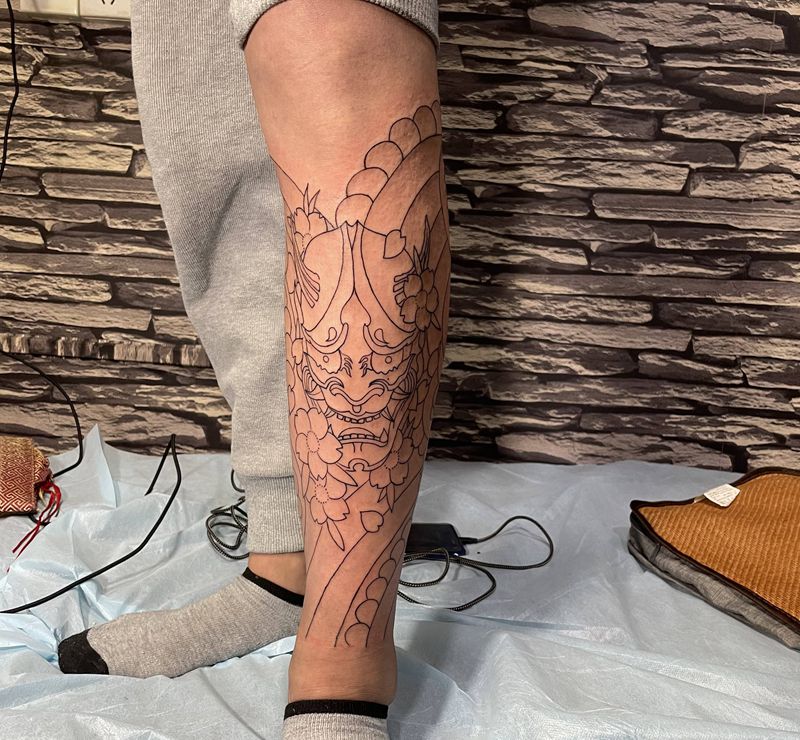 般若樱花老传统线条纹身图片_腿部老传统纹身图案