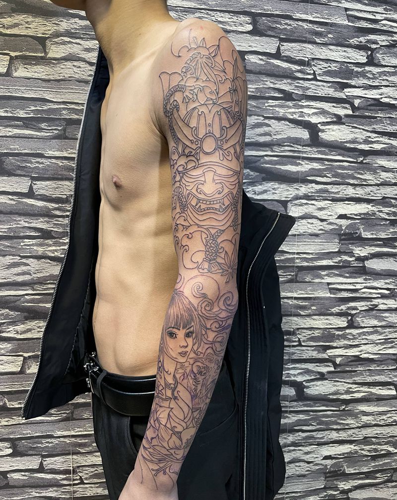 当前位置: 首页 >广东省中山市纹身店-吉刺青纹身图案>鬼武士➕艺妓纹身图片_手臂新传统纹身图案