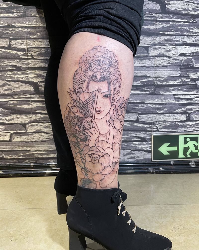 紫霞仙子遮盖旧纹身纹身图片_腿部新传统水墨纹身图案