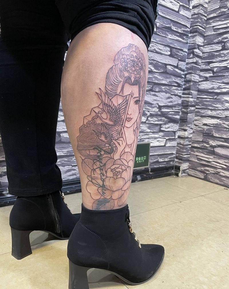 紫霞仙子遮盖旧纹身纹身图片_腿部新传统水墨纹身图案