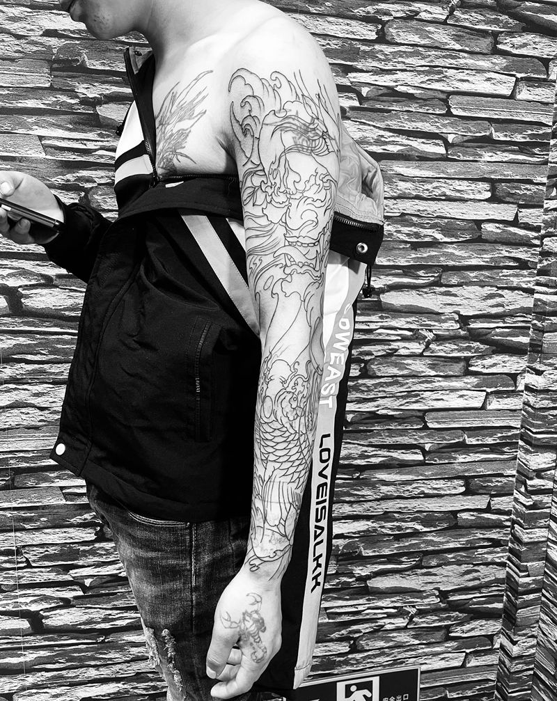 当前位置: 首页 >广东省中山市纹身店-吉刺青纹身图案>般若➕鲤鱼花臂线条纹身图片_手臂新传统纹身图案