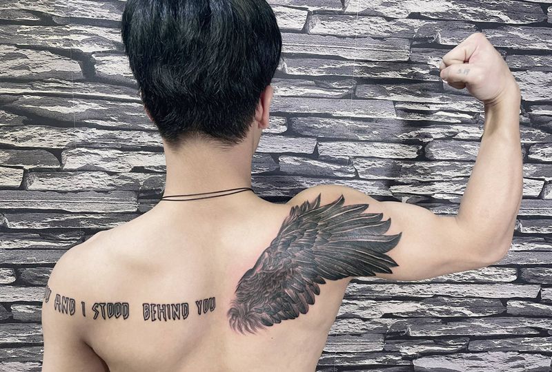 当前位置: 首页 >广东省中山市纹身店-吉刺青纹身图案>翅膀➕英文纹身图片_肩部手臂欧美写实水墨纹身图案