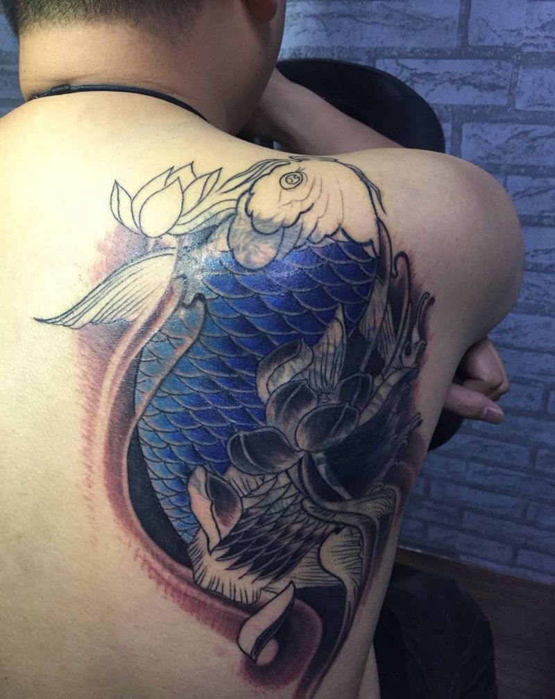 鲤鱼纹身纹身图片_成品背部传统动物植物纹身图案