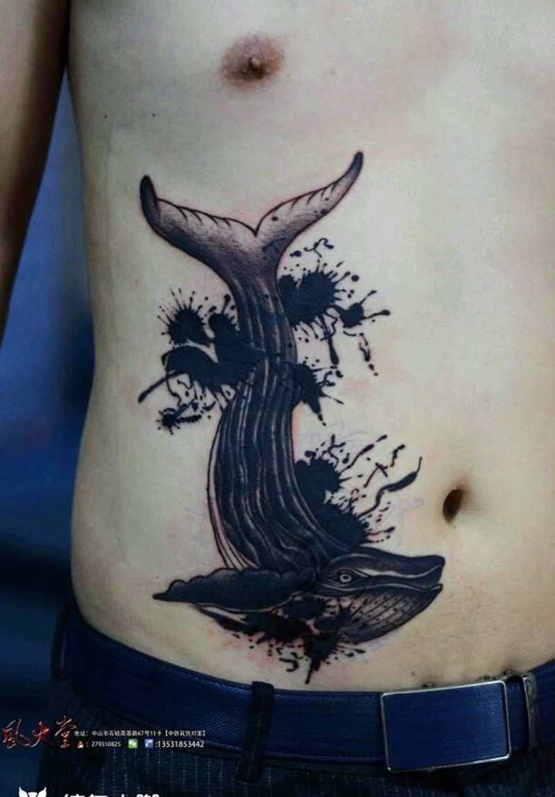 蓝鲸遮盖旧图完成纹身图片_腹部欧美动物成品纹身图案
