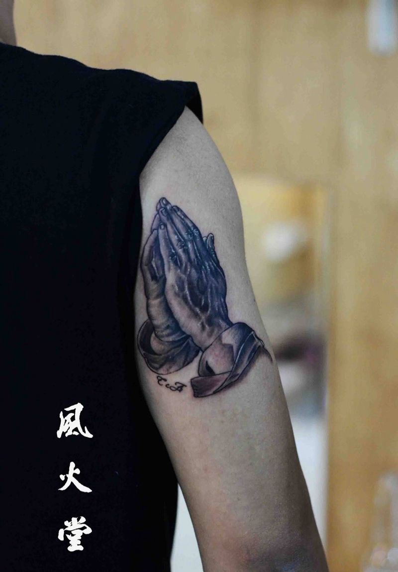 当前位置: 首页 >广东省中山市纹身店-中山风火堂纹身店纹身图案>祈祷之手纹身图片_成品肩部写实宗教纹身图案
