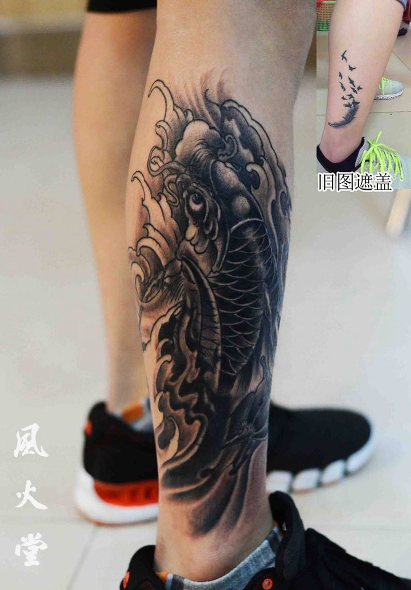 设计鲤鱼遮盖纹身纹身图片_成品腿部传统动物纹身图案