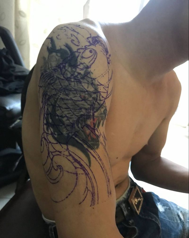 当前位置: 首页 >广东省中山市纹身店-中山风火堂纹身店纹身图案>鲤鱼遮盖滴血狼头纹身图片_成品手臂传统动物纹身图案