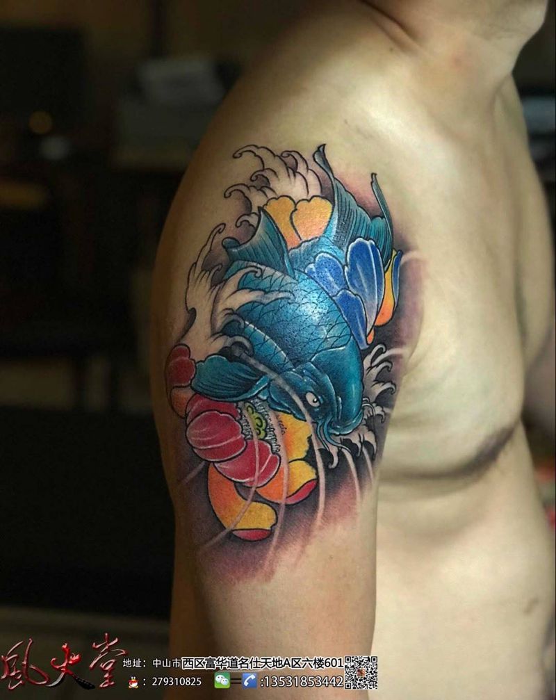 当前位置: 首页 >广东省中山市纹身店-中山风火堂纹身店纹身图案>鲤鱼遮盖纹身图片_成品手臂传统动物纹身图案