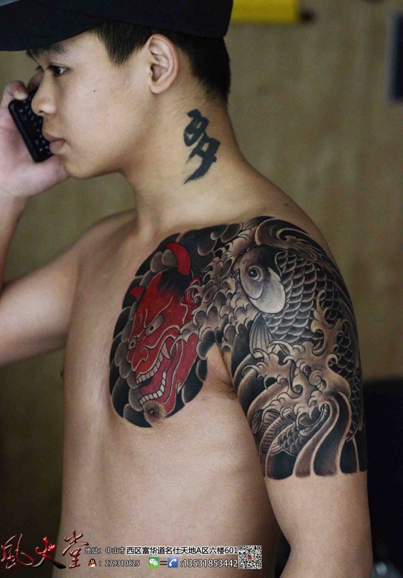 日式传统半甲纹身纹身图片_成品手臂胸部传统鬼神纹身图案