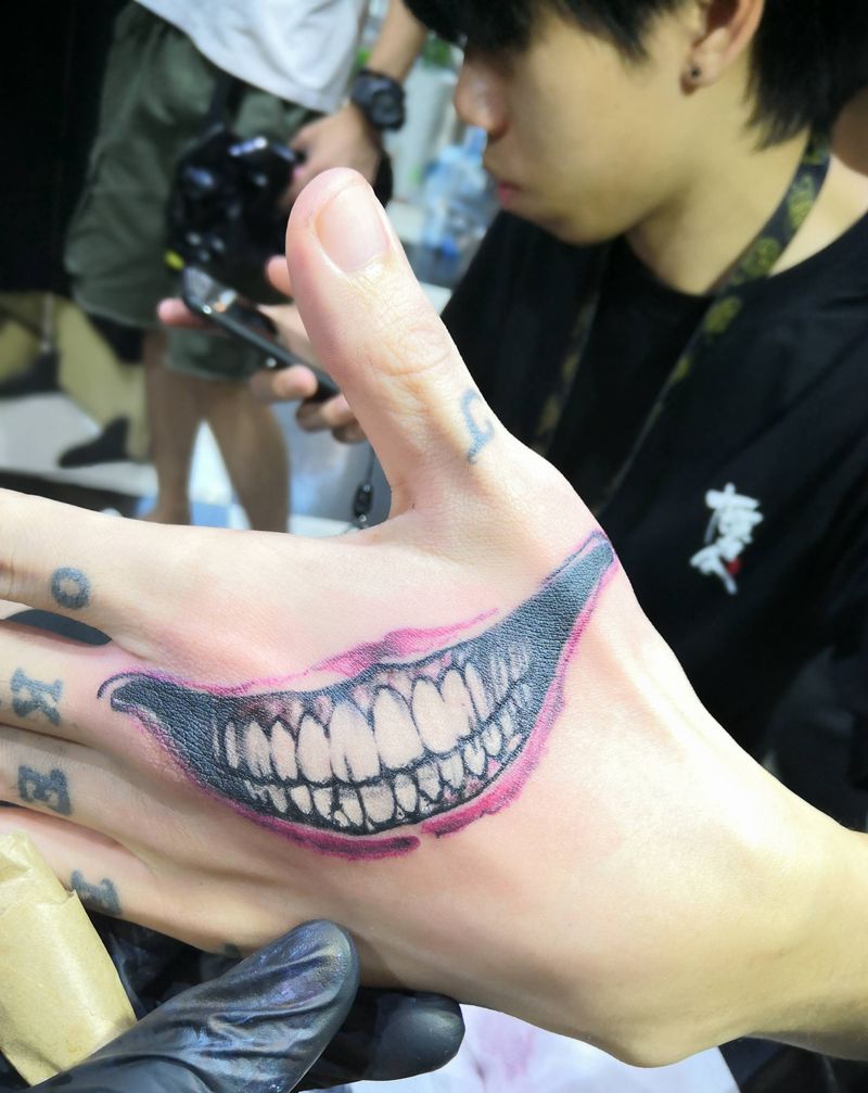小丑嘴巴笑脸纹身图片_手部背部欧美写实纹身图案