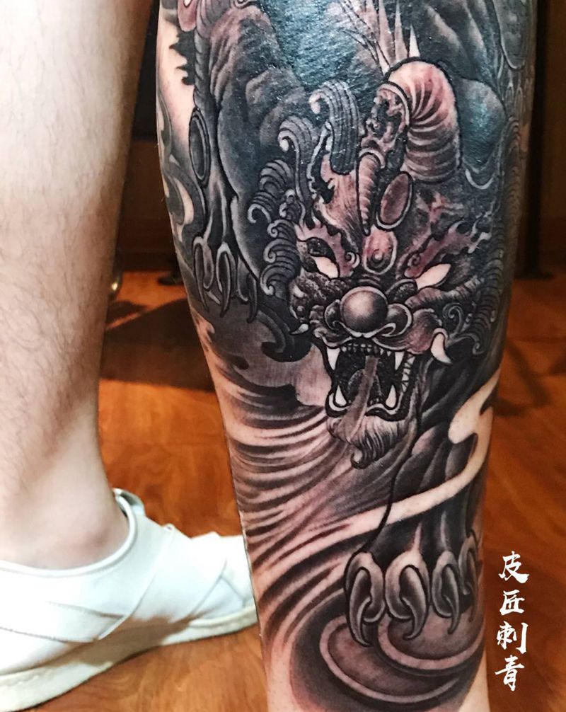 • T网红王老大花腿龙纹身图片_腿部新传统纹身图案