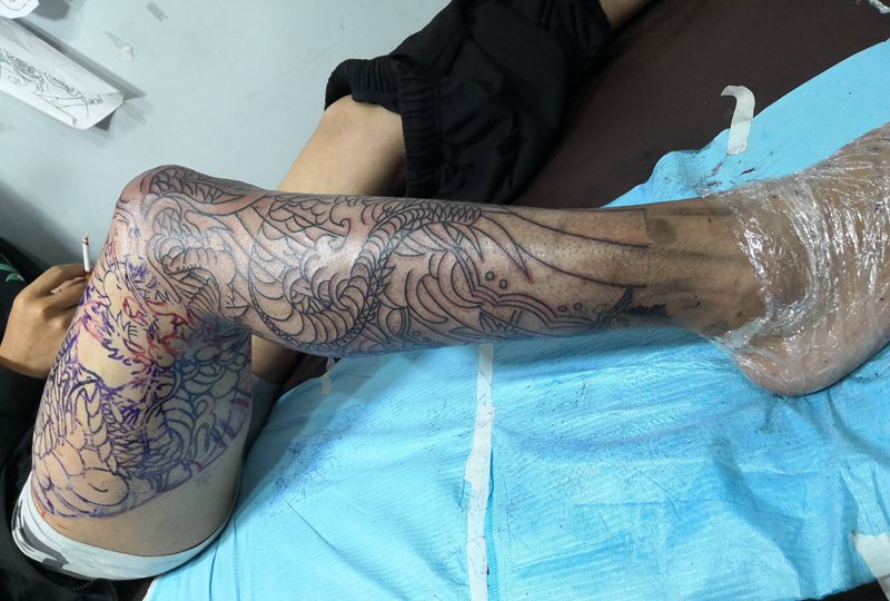 • T网红王老大花腿龙纹身图片_腿部新传统纹身图案
