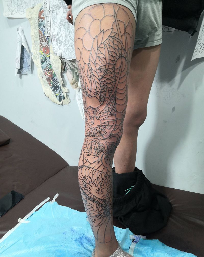 • T网红王老大花腿龙纹身图片_腿部新传统纹身图案