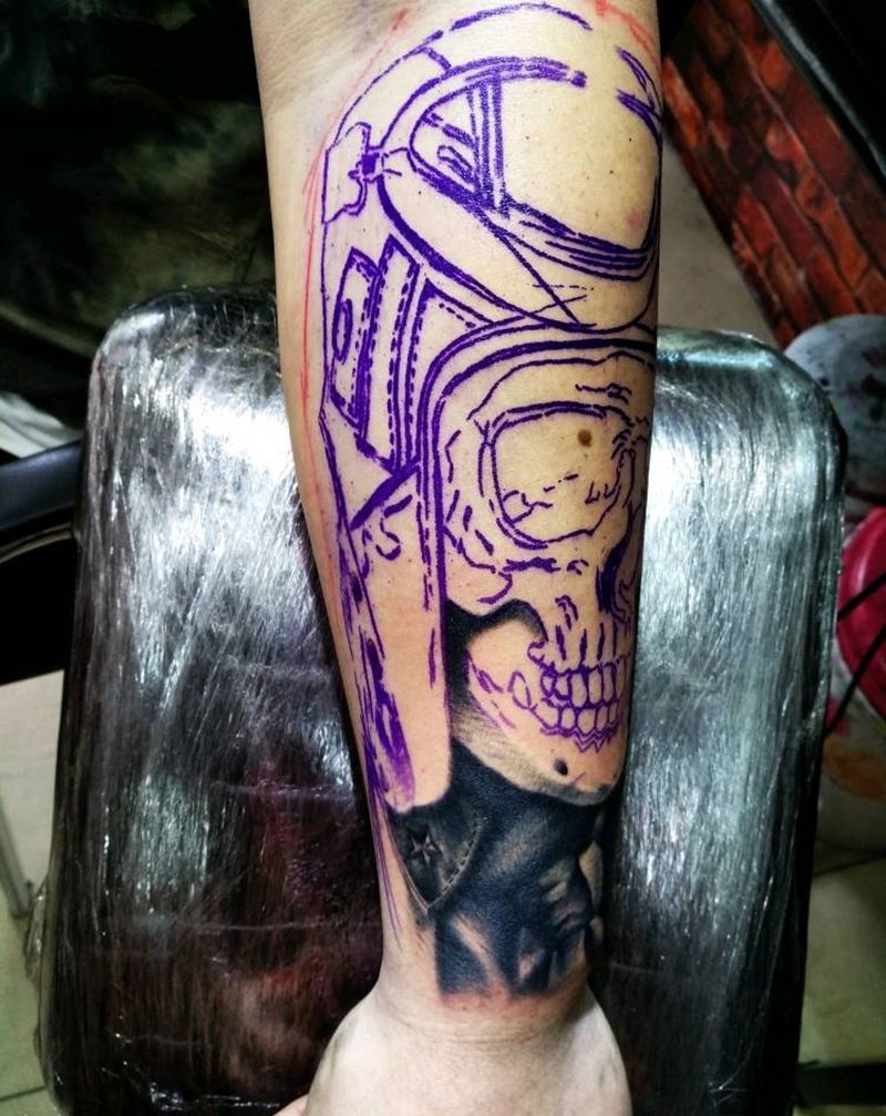 当前位置: 首页 >广东省中山市纹身店-精艺纹身纹身图案>小臂半侧骷髅纹身图片