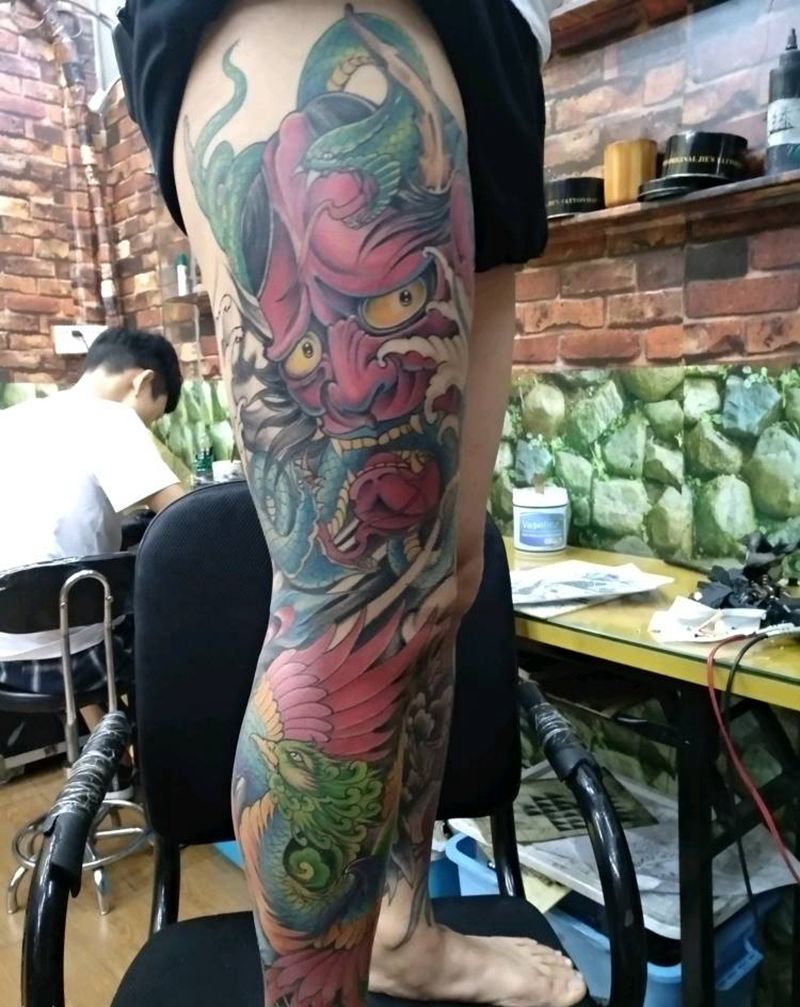 • T网红王老大花腿龙纹身图片_腿部新传统纹身图案