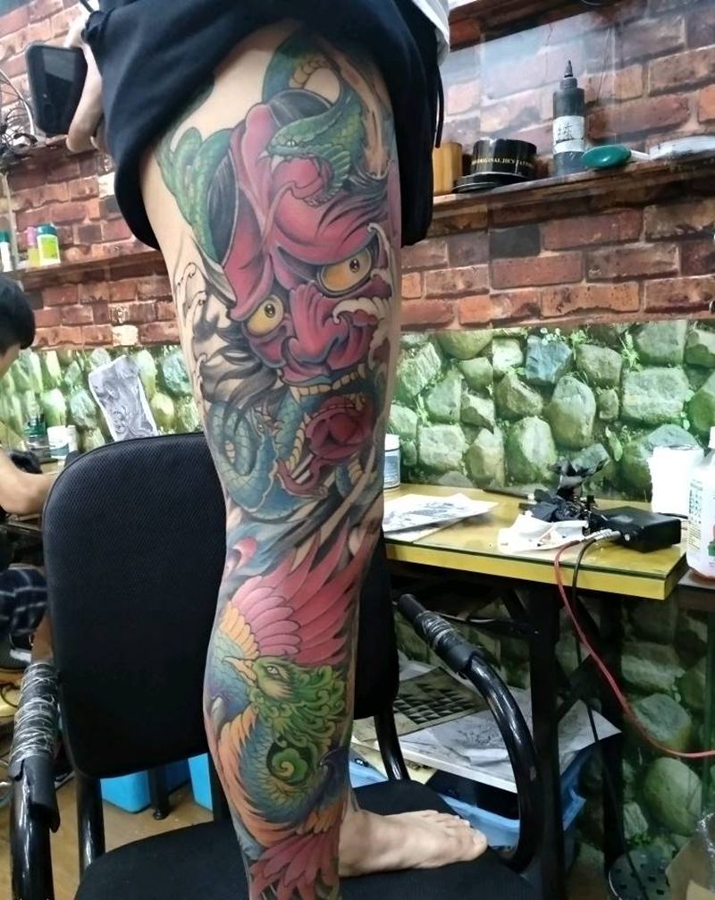 • T网红王老大花腿龙纹身图片_腿部新传统纹身图案