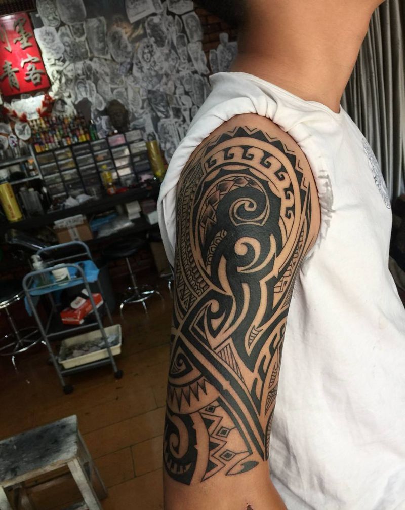 当前位置: 首页 >广东省中山市纹身店-墨客纹身刺青纹身图案>修改玛雅图腾包臂纹身图片