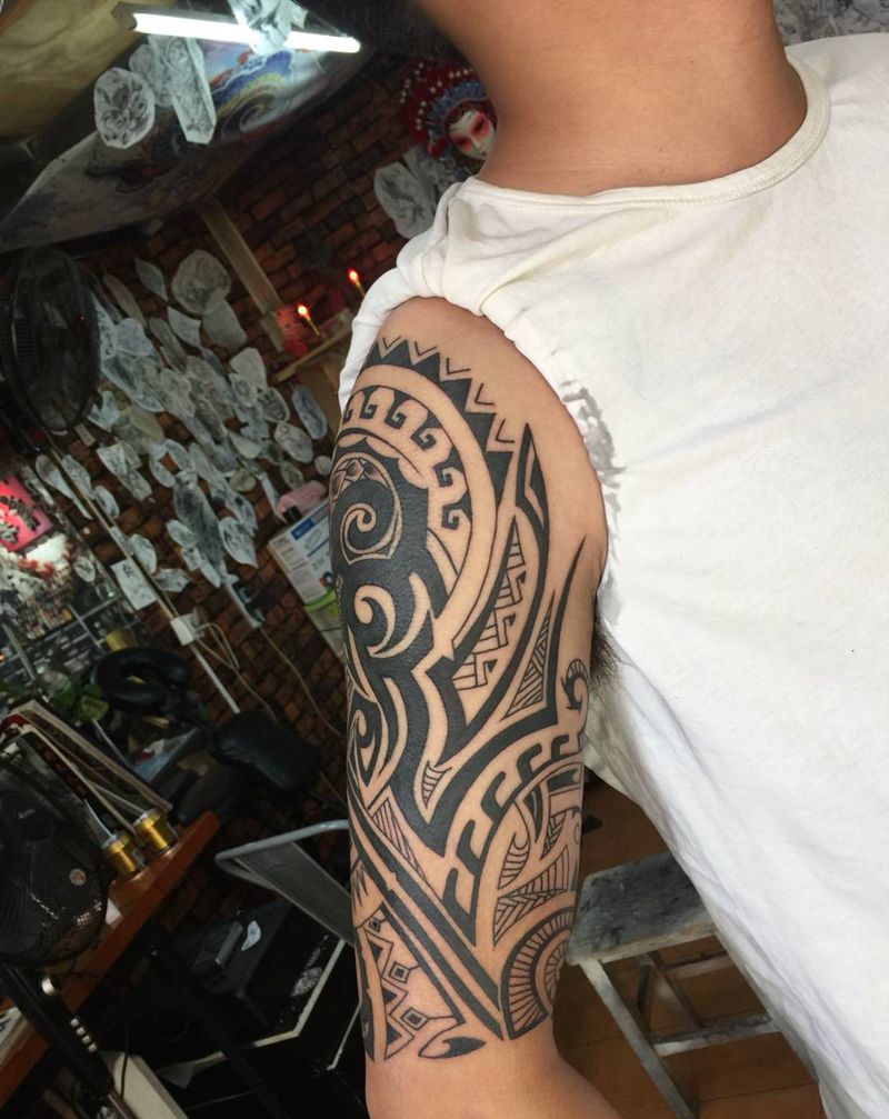 当前位置: 首页 >广东省中山市纹身店-墨客纹身刺青纹身图案>修改玛雅图腾包臂纹身图片