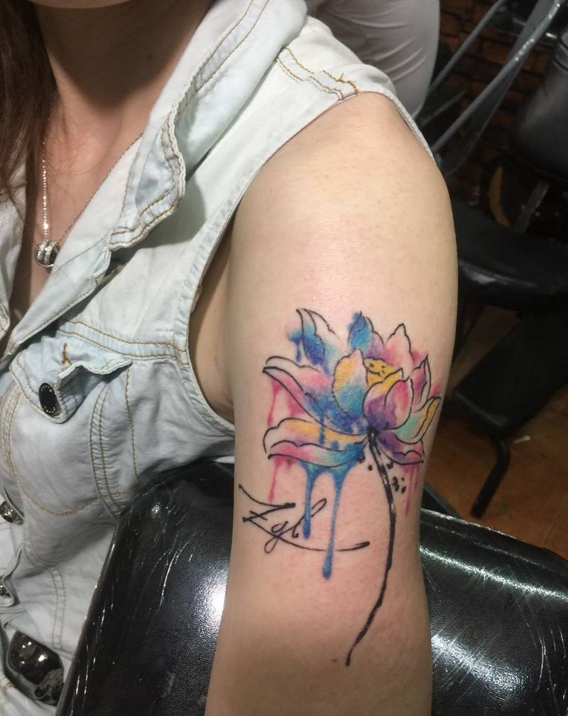 当前位置: 首页 >广东省中山市纹身店-墨客纹身刺青纹身图案>彩色泼墨莲花纹身图片